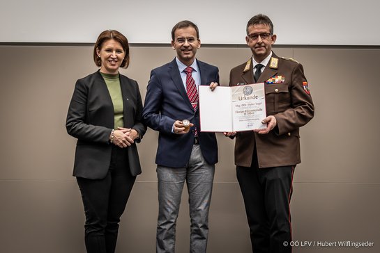 Ehren-Landesbranddirektor Dr. Wolfgang Kronsteiner wurde mit dem Großen Florian-Verdienstkreuz des Oö. LFV als Dank und Anerkennung für die langjährige Arbeit an der Spitze des Oö. Landes-Feuerwehrverbandes, geehrt.