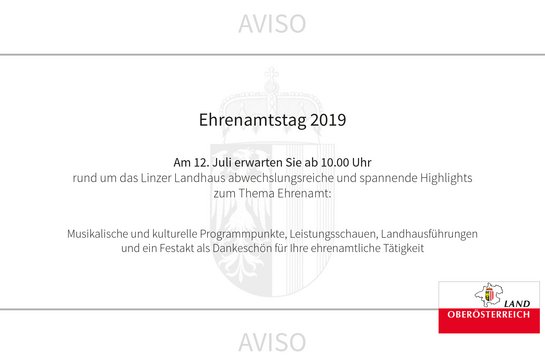 Zu einem Ehrenamtstag lädt Landeshauptmann Mag. Thomas Stelzer all jene Organisationen ein, welche mit Ehrenamtlichen und Freiwilligen tagtäglich im Dienste für das Bundesland Oberösterreich stehen. Das Feuerwehrwesen darf dabei nicht fehlen und ist deshalb eingeladen, an der Veranstaltung teilzunehmen. Der Ehrenamtstag findet am Freitag, 12. Juli 2019 ab 10 Uhr beim Linzer Landhaus statt.