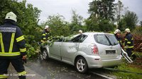 Eine am rechten Fahrbahnrand befindliche Eiche wurde durch die extremen Windböen und den aufgeweichten Boden entwurzelt und stürzte auf ihr Auto, wobei sich die Frau noch immer darin befand. Die 58-Jährige wurde in ihrem Fahrzeug eingeklemmt und bisher unbestimmten Grades verletzt. Ein hinter ihr stehender Autofahrer leistete augenblicklich Erste Hilfe und verständigte den Notruf. Die Feuerwehr befreite die Frau aus ihrem Fahrzeug. Nach notärztlicher Erstversorgung wurde sie ins UKH Salzburg geflogen.