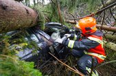 3. Mehrere Bäume knickten durch ein Starkwindereignis um und verlegten eine wichtige Verbindungsstraße. Zudem wurde bei der Erkundung festgestellt, dass sich ein Fahrzeug unter den schweren Baumstämmen befindet. Die Katastrophenhilfsdiensteinheiten hatten die Aufgabe, die eingeklemmten Personen zu retten und diesen Windbruch aufzuarbeiten.