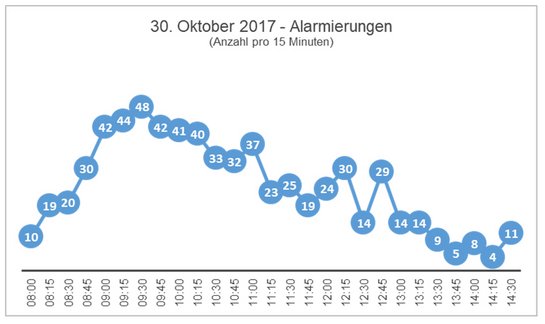 Hier eine Übersicht über die Alarmierungen in der Kernzeit des Sturmdurchganges vom 30. Oktober 2017.
