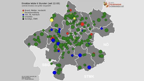Am Samstag, 23.12.2023 entspannte sich am Abend die Situation zunehmend. Sowohl die IntensitĂ€t der Sturmspitzen als auch die der RegenfĂ€lle nahmen ab und dies fĂŒhrte auch zu einer Entspannung bei den oberösterreichischen Feuerwehren. Trotzdem waren auch in der Nacht auf Sonntag, den 24.12.2023 rund 30 Feuerwehren im Einsatz, um SturmschĂ€den oder Ăberflutungen zu beseitigen.