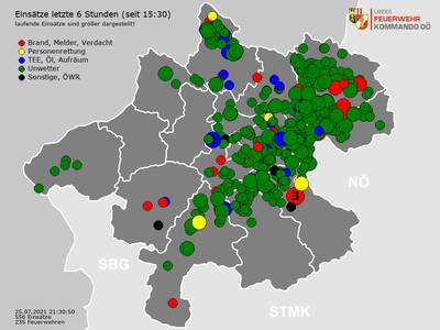 Mit voller Wucht wurde der Zentralraum Oberösterreichs von der durch die Wetterdienste prognostizierten Unwetterfront getroffen. Diese zog über das Innviertel kommend über alle Bezirke Richtung Nordosten. Insgesamt wurden ab 18:00 Uhr 1.200 Unwettereinsätze verzeichnet bei denen 4.600 Feuerwehrmitglieder aus 330 Feuerwehren im Einsatz standen.