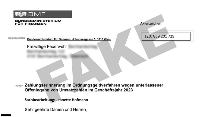 Immer mehr Feuerwehren erhalten Fake-Mails mit einem Fake-Bescheid des Finanzamts mit Zahlungsaufforderung. Hier ist Vorsicht geboten!